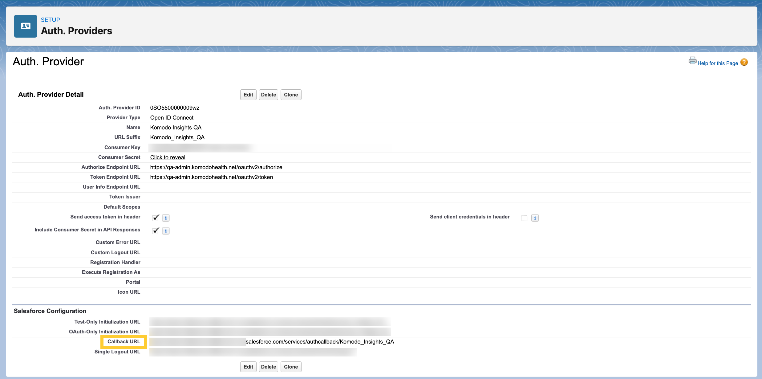 To allow your users to log into the custom Komodo Insights Component with their Salesforce credentials, you need to create a Salesforce authentication provider.