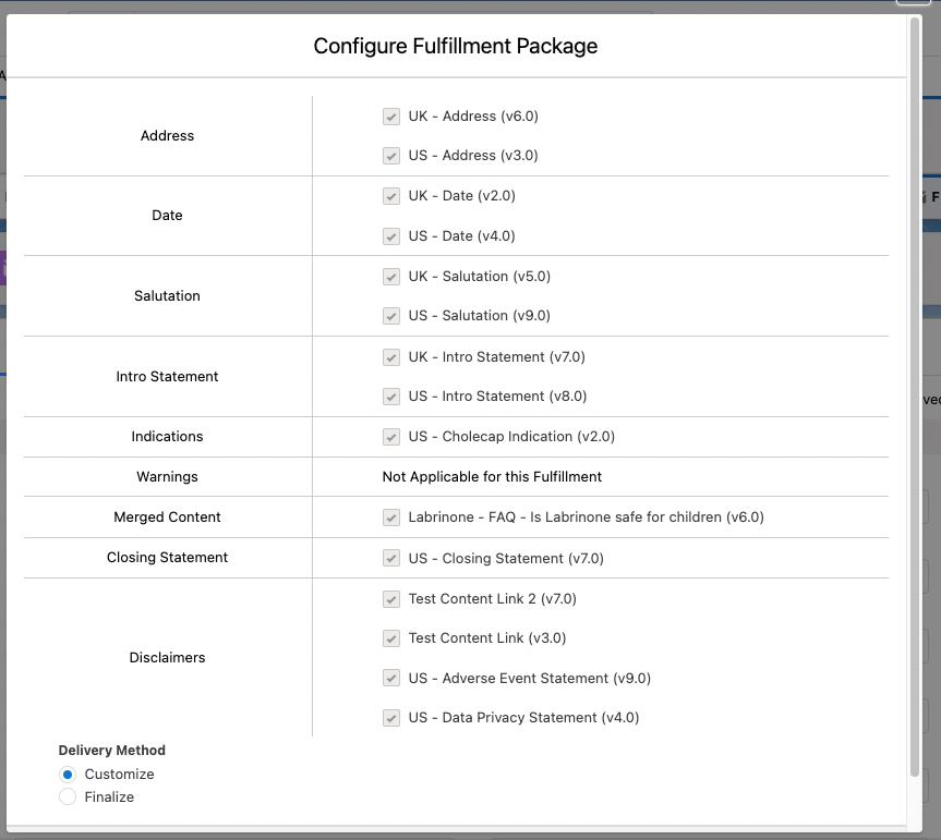 A Fulfillment record is a child record of an Interaction. From a Fulfillment record, you can create a package of information to send via email, mail, or fax to the Account that submitted the inquiry. A Fulfillment Package includes: