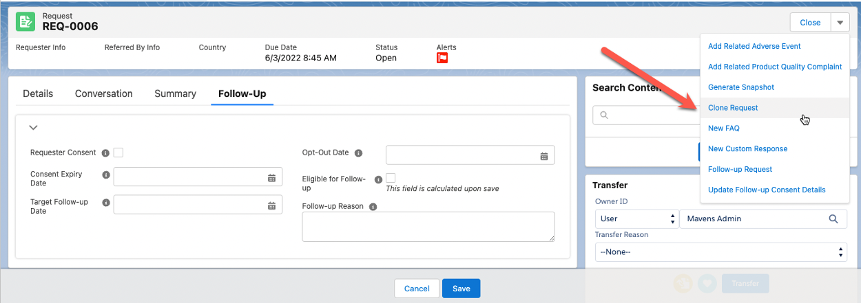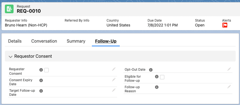 Note: You can use the Update Follow-up Consent Details quick action button if the request is open or closed. However, once the request is closed, you can only use the quick action button to update consent information.