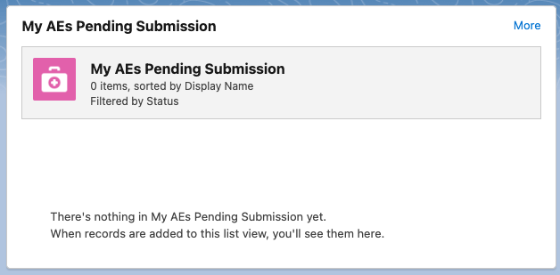 • My AEs Pending Submission - shows pending AE submissions. Users can click More in the top right corner to view their Adverse Events page.