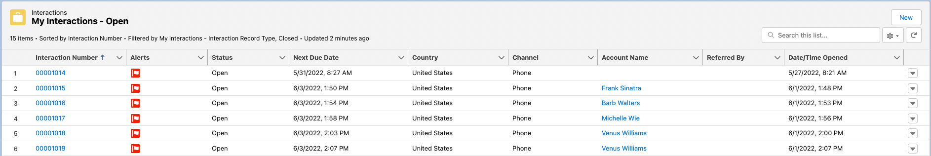 • My Interactions - Open - shows the logged-in user's open interactions. New Interactions can also be created from this section by clicking New in the top right of the section's highlight panel.