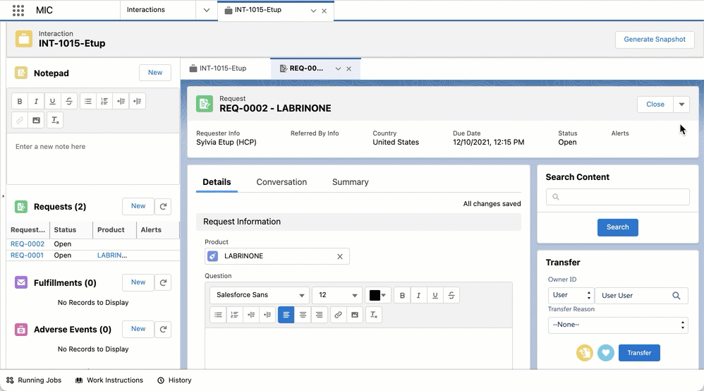 Inquiry Management makes heavy use of the Salesforce Service Cloud Console and has been configured to display multiple Lightning components.