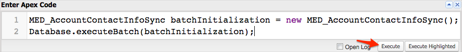 2. Enter the following code: MED_AccountContactInfoSync batchJob = new MED_AccountContactInfoSync();``Database.executeBatch(batchJob);