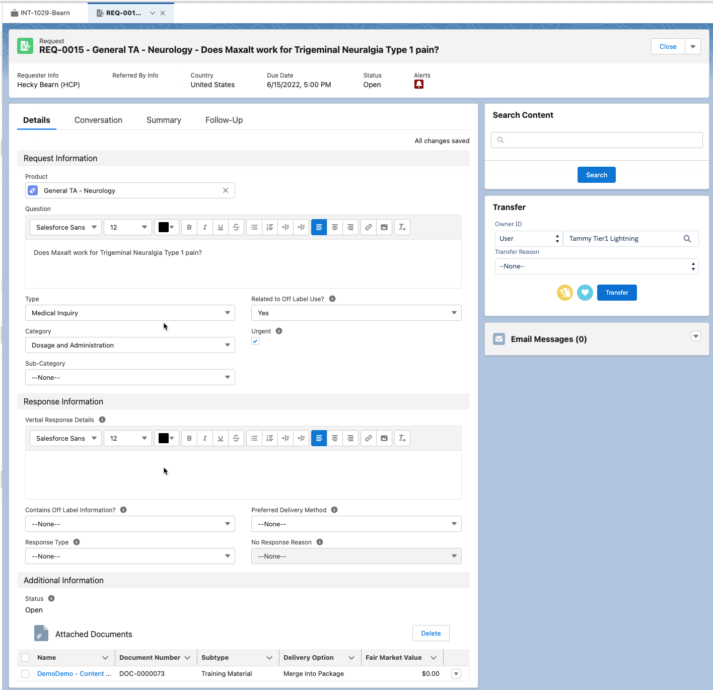 A Request is a child record of an Interaction. Each Request stores information about the account's inquiry and any responses that have been provided. There can be multiple Requests in a single Interaction. For example, if a Health Care Provider asks three questions on a call, you will create a single Interaction and three Request records underneath that Interaction.