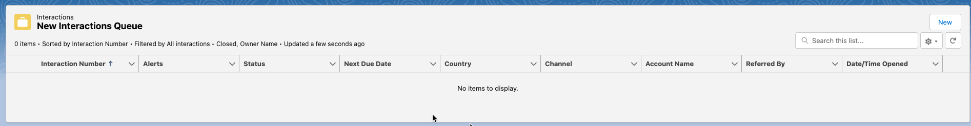 • New Interactions Queue - shows any newly assigned or created interactions for the logged-in user. Users can also create new Interactions from this section by clicking New in the top right corner of the section.