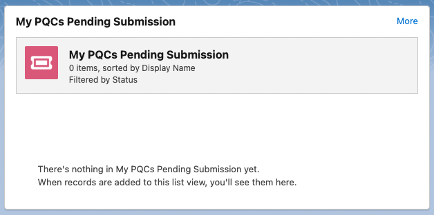 • My PQCs Pending Submission - shows pending PQC submissions. Users can click More in the top right corner to view their Product Quality Complaint page.