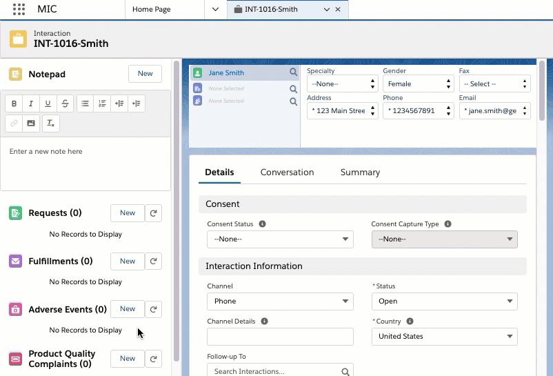 The primary objects in Inquiry Management are Interaction, Request, Fulfillment, Adverse Event, and Product Quality Complaint. With these objects, you can record and manage medical inquiries. Specifically, when a Requester reaches out to your Contact Center, you can create a new Interaction record to store the Requester's contact information and information about how and when the Requester contacted the Contact Center. From this Interaction record, you can then create child records to capture and address inquiries and record reported Adverse Events and Product Quality Complaints. An Interaction can have more than one child record of the same type.