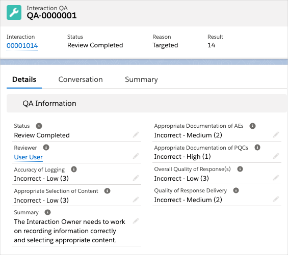 In the Status field, select Review Completed to close the QA Interaction record and mark the review as done.