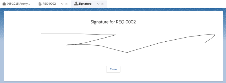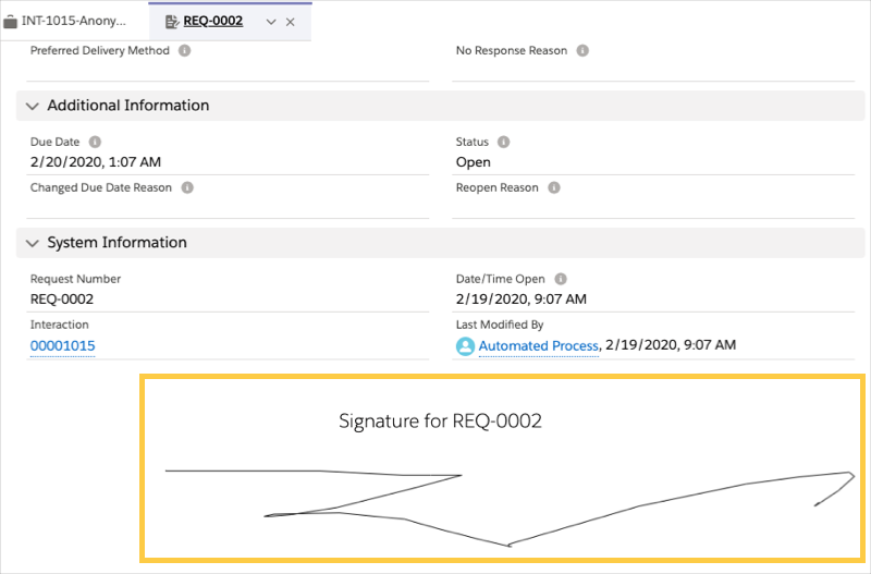 Chatter Post - when an inbound form with a signature is received, a chatter post is made against the corresponding Interaction and Request that indicates a signature is present, alongside a link to the signature viewer component. Once clicked, the signature is presented in a new tab similar to the image above.