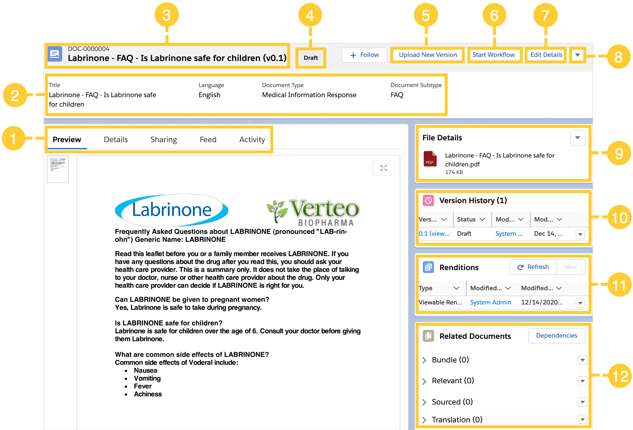 | 1 | Record Tabs | Record tabs include: - Preview - displays a preview of the file associated with the document if the file is hosted in Salesforce. Visit Files. - Details - displays document metadata. - Sharing - lists the users that have access to the document and the role(s) they have. Roles determine what users can see and do as a document goes through its lifecycle. Depending on your permissions, you can perform several actions from the Sharing tab. Actions include: - View assigned permissions. To see the permissions, click the Arrow |