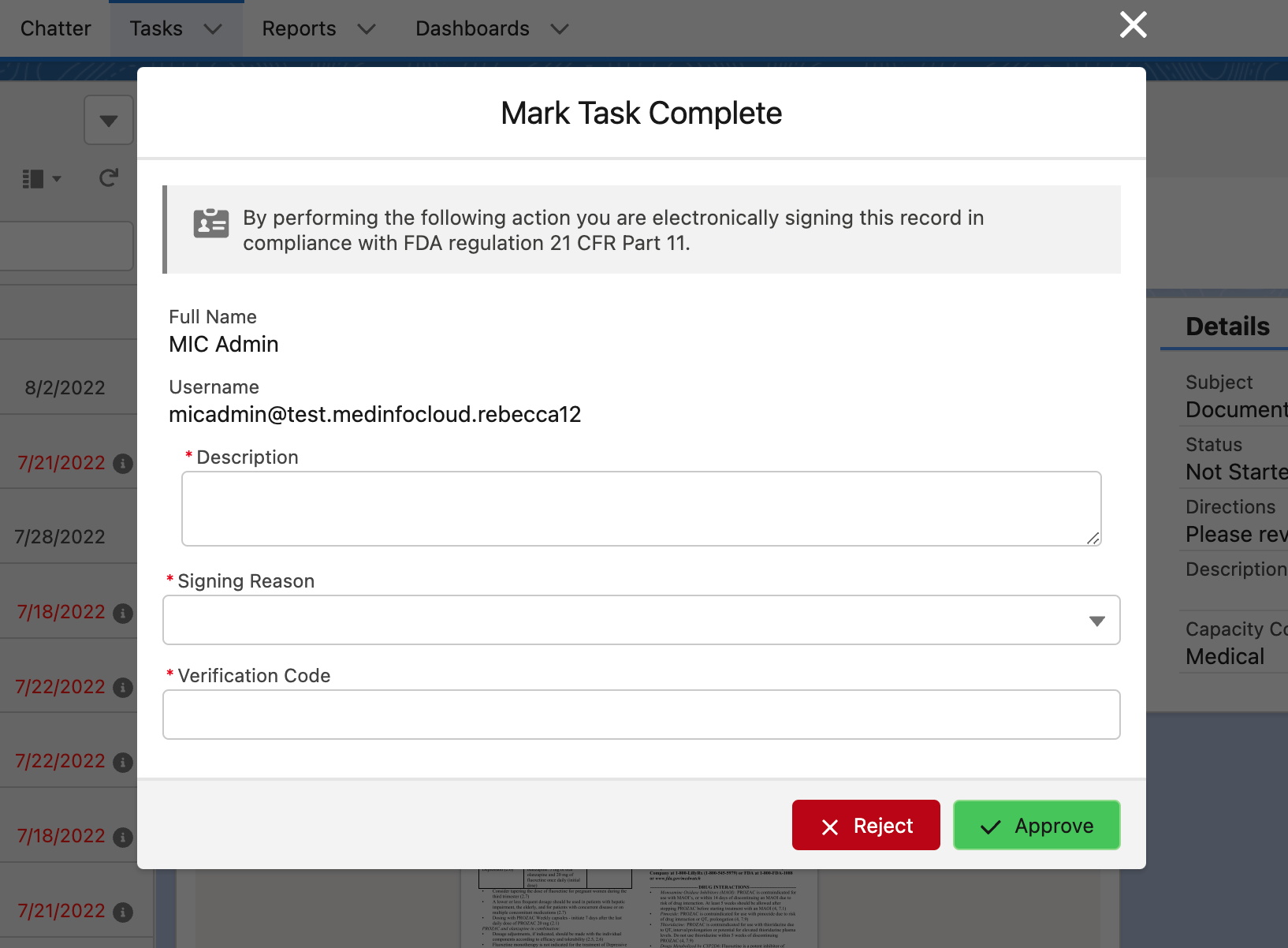 If you need to maintain 21 CFR Part 11 compliance or want users to verify their identity when performing sensitive actions, you can enable electronic signatures in your environment. With electronic signatures, users verify their identity by inputting one-time verification codes from a TOTP-compatible authenticator app when completing tasks, such as reviewing and approving documents.