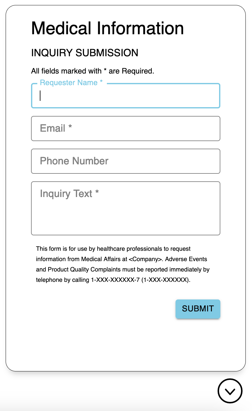 will be launching a completely new, platform-agnostic engagement web component that enables our Inquiry Submission feature to be embedded into any website managed by your organization. This helps medical information teams cast a wider net to reach your website's audience and enable them to submit medical inquiries that are automatically routed to your existing request queue(s). This new component can be configured to inherit contextual details, such as product, country, language, and more.