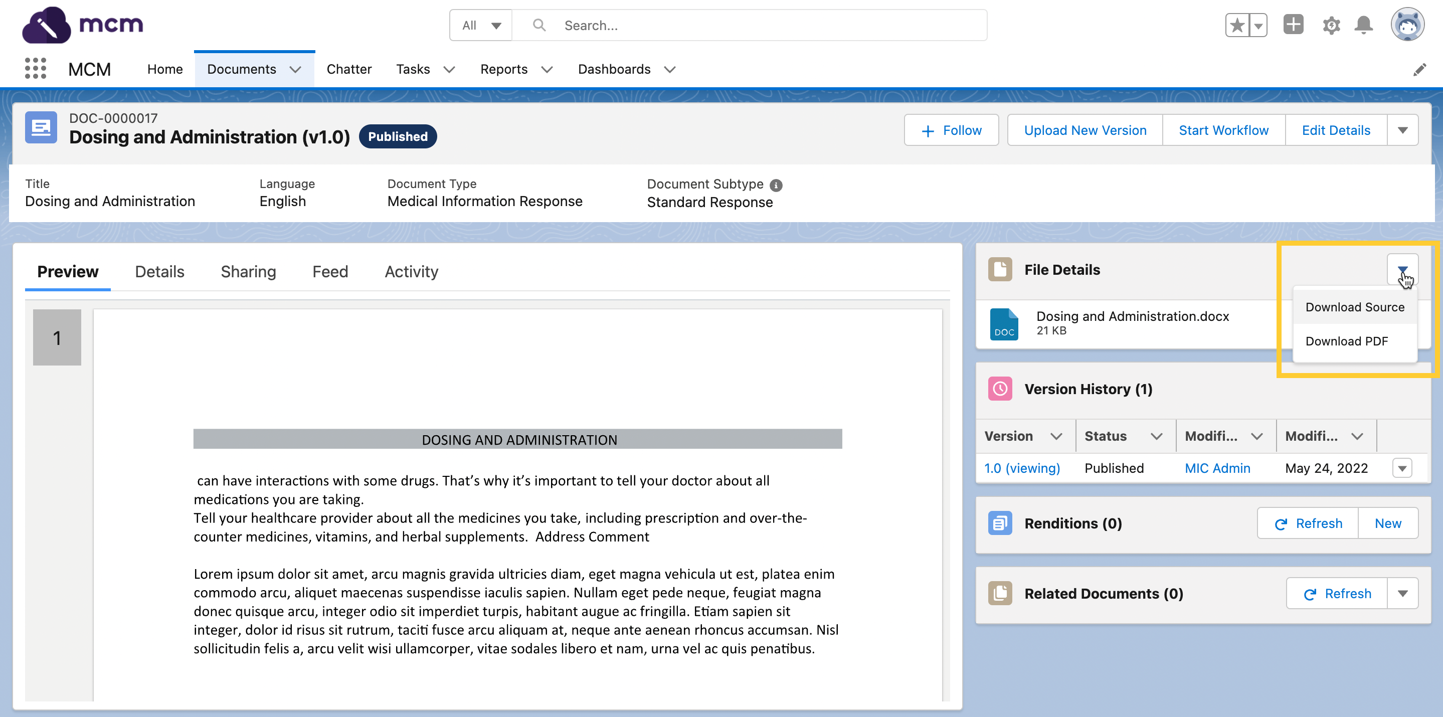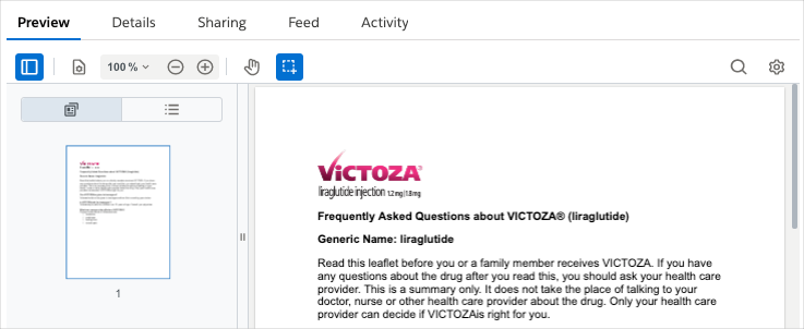 File previews are generated for files hosted in Salesforce and displayed in the Preview tab on the document record page. The MCM-enhanced document viewer attempts to render all files. If the file does not meet the viewer's requirements, Salesforce's content previewer attempts to generate the preview. If a document does not have a file and the Content (rich text) (mvn__CM_Content_Rich_Text__c) field on the Document Version (mvn__CM_Document_Version__c) record is available on the document preview layout, then the rich text content will appear in place of the file for the document preview instead.