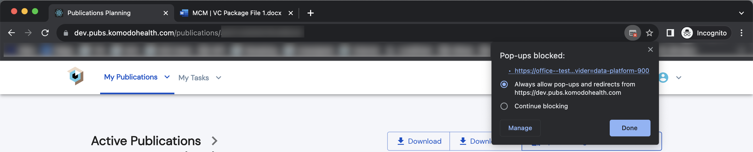 Warning: To ensure that all of the Microsoft 365 package files open in separate tabs as expected, external collaborators must allow pop-ups from the Collaborator Portal. For more information on how to allow pop-ups in Chrome, reference Block or allow pop-ups in Chrome.