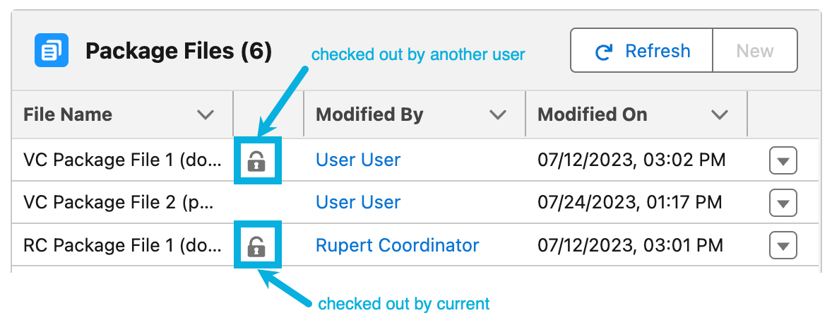 Once a user checks out the parent document version, only that same user can create, replace, and delete package files. All other users can only preview and download package files locally or check out, review, and edit package files in Microsoft 365. For each package file that is checked out, a lock icon will appear locked if the package file is checked out by another user or unlocked if the package file is checked out by the current user. Additionally, a message will appear at the top of the record page to indicate that one or more package files are checked out. Package files that are checked out cannot be replaced or deleted.