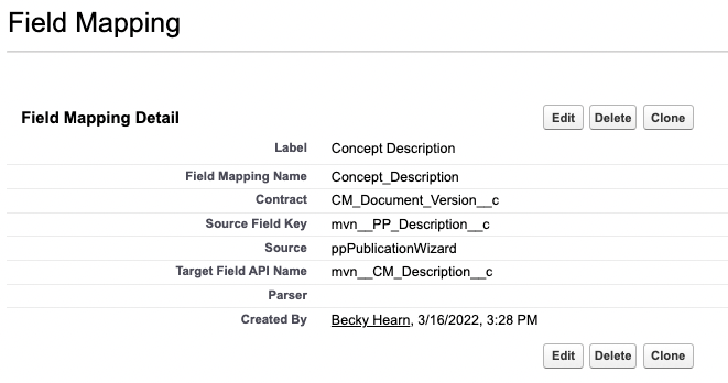 | Target Field API Name | The API name of the Document Version field from which the value will be drawn. Example: mvn__CM_Description__c |