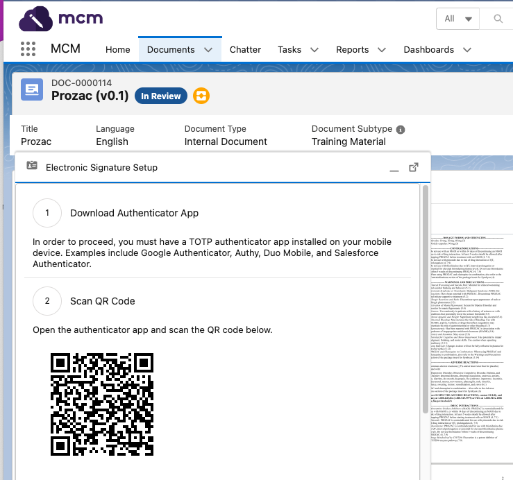 Note: To complete electronic signature configuration, users must have a TOTP-compatible authenticator app, like 1Password, Google Authenticator, Microsoft Authenticator, or Salesforce Authenticator.