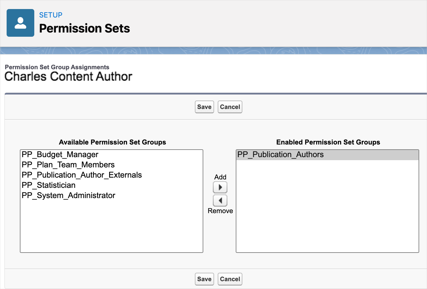 | PP_Content_Author | mvn__PP_Content_Author | None | Users with this permission set are provisioned access to content objects and fields specific to Scientific Publications Cloud product. Note: This permission set should be used in conjunction with CM_ContentAuthor. |